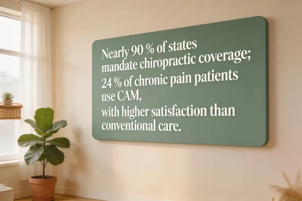 Nearly 90 % of U.S. states require insurers to cover chiropractic care, while roughly one‑quarter of states have similar mandates for acupuncture, creating broad financial access to both modalities. Real‑world data from a large HMO showed that 24 % of adult members met criteria for chronic musculoskeletal pain, and 6 % of those patients received acupuncture or chiropractic referrals, highlighting modest but growing CAM utilization. Patient satisfaction mirrors this accessibility: 59 % of individuals with back pain reported being highly satisfied with chiropractic care, compared with 53 % for acupuncture, both exceeding satisfaction rates for specialist physicians (44 %) and primary‑care providers (34 %). These figures underscore that insurance reimbursement policies are pivotal in driving CAM adoption and that patients perceive integrated chiropractic‑acupuncture services as effective, non‑pharmacologic options for chronic pain management.