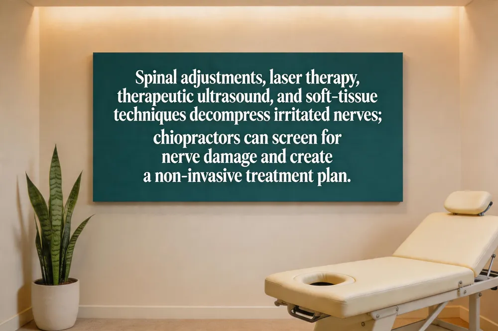 Chiropractors treat post‑collision nerve pain with spinal adjustments that restore alignment and gentle decompression to relieve pressure on irritated nerves. Laser therapy and therapeutic ultrasound improve blood flow, reduce inflammation, and accelerate tissue repair. Soft‑tissue techniques—massage, myofascial release, and targeted stretching—along with ergonomic advice (lumbar rolls, seat cushions, posture cues) help prevent re‑compression.