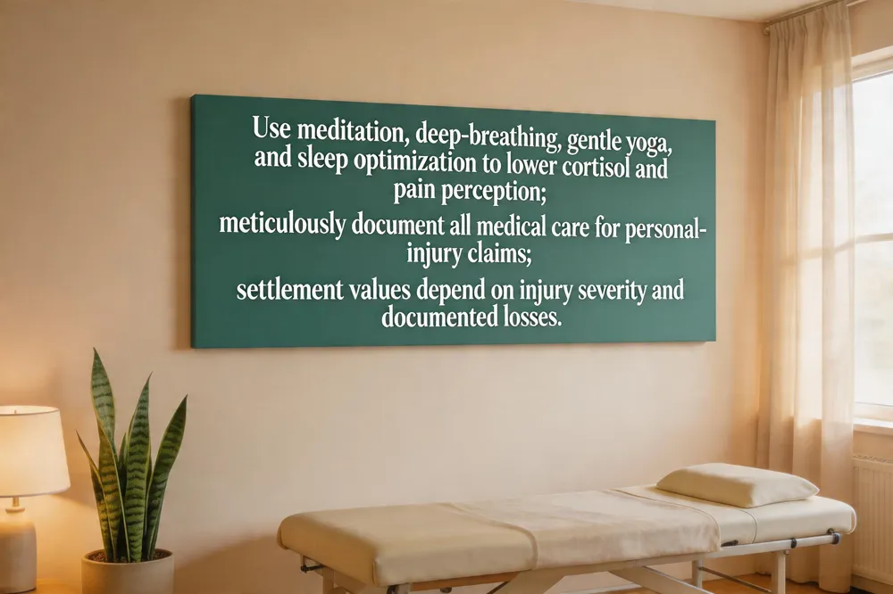 Mind‑body techniques such as meditation, deep‑breathing, and gentle yoga help calm the nervous system, lower cortisol, and reduce perceived nerve pain after a crash. Pair these practices with sleep optimization—aim for 7‑9 hours, maintain a dark, cool bedroom, and avoid screens before bedtime—to enhance tissue repair and pain tolerance.