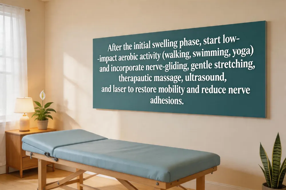 Gentle stretching and low‑impact aerobic activity (walking, swimming, yoga) restore circulation and prevent stiffness after the initial 48‑72‑hour swelling phase. Nerve‑gliding (neurodynamic) exercises safely mobilize irritated nerves, reducing adhesions and promoting normal glide. Physical‑therapy modalities such as manual therapy, therapeutic ultrasound, and laser therapy further decrease inflammation and improve blood flow to damaged tissues. A gradual return to daily activity—starting with short, controlled movements and progressing under professional supervision—helps rebuild strength while protecting healing nerves.