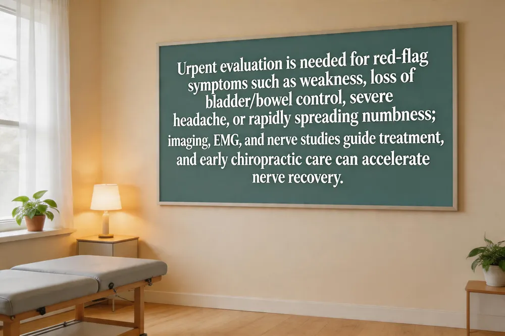 Red‑flag symptoms that demand urgent evaluation include new or worsening weakness, loss of bladder or bowel control, severe headache with vomiting, chest pain, breathing difficulty, or rapidly spreading numbness, especially in the saddle area. If you notice persistent tingling, burning, shooting pain, or unexplained muscle weakness that does not improve within a few days, seek care promptly. Imaging studies such as MRI or CT scans can reveal disc herniations, spinal fractures, or nerve compression, while nerve conduction studies and EMG track electrical activity and pinpoint damaged pathways. Referral pathways typically begin with a primary care physician or urgent‑care clinician who may order imaging and then direct you to specialists—neurologists, orthopedists, pain‑management physicians, or chiropractors—for targeted therapy.