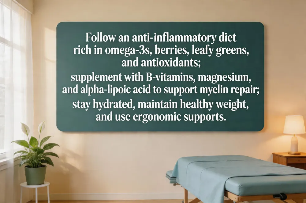 A healing anti‑inflammatory diet—rich in omega‑3 fatty acids, berries, leafy greens, and other antioxidant‑dense foods—helps reduce systemic inflammation that can aggravate post‑collision nerve pain. Complement the diet with nerve‑supporting nutrients such as B‑vitamins (B1, B6, B12), magnesium, and alpha‑lipoic acid, all of which aid myelin repair and nerve conduction. Adequate hydration and maintaining a healthy weight lessen mechanical stress on the spine and peripheral nerves, while ergonomic supports (lumbar rolls, seat cushions, proper footwear) and mindful posture protect against further compression.