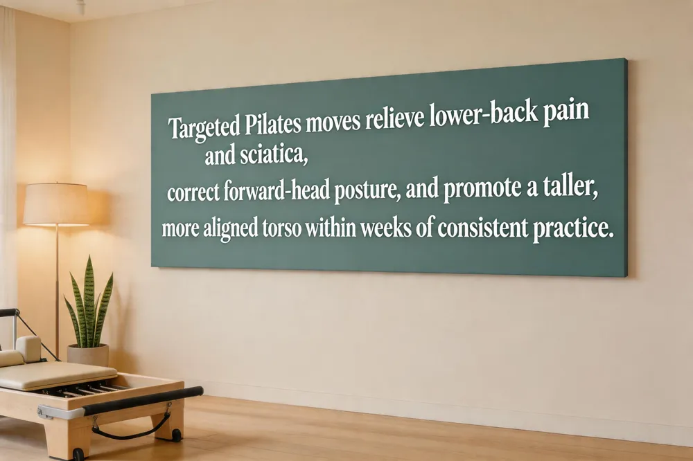 Pilates for lower back pain and sciatica: Gentle Pilates movements that lengthen the spine, engage the deep core, and improve hip and lumbar mobility can relieve lower‑back pain and reduce sciatica symptoms without high impact. Core‑strengthening exercises such as pelvic tilts and dead‑bugs stabilize the spine, helping to off‑load the sciatic nerve. Stretching‑focused moves like the figure‑4 stretch, supine spine twists, and knee‑to‑chest promote flexibility in the glutes, hamstrings, and lower back, easing nerve compression. Progressions should be slow, pain‑free, and performed in a neutral spine to avoid overstretching the nerve. For best results, work with a qualified Pilates instructor or chiropractor to tailor the routine to your specific condition.