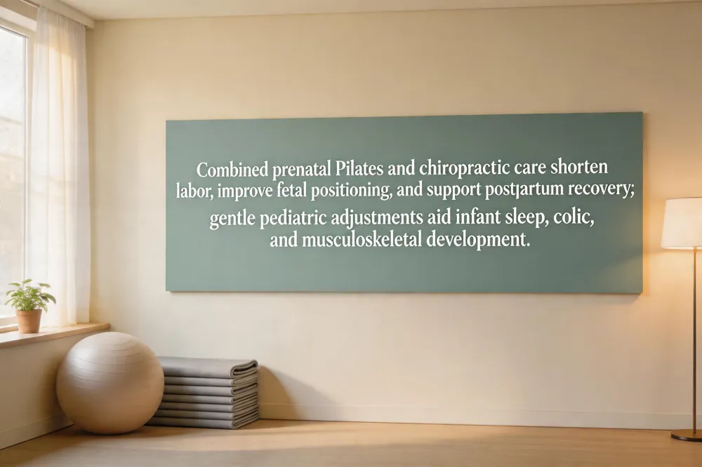 Prenatal chiropractic care focuses on maintaining optimal spinal alignment and pelvic balance, which directly reduces the low‑back, neck, and joint pain that many pregnant women experience. By correcting pelvic misalignments, the uterus gains more space, improving fetal positioning and decreasing the incidence of breech presentation. Studies report that women who receive regular adjustments enjoy shorter labor times—up to 25–31 % shorter—and a lower likelihood of cesarean delivery. Post‑partem care supports maternal recovery, helps control nausea, and promotes overall family wellness. In the pediatric population, gentle spinal adjustments have been shown to ease infantile colic, improve sleep quality, and foster healthy musculoskeletal development. Additional benefits include reduced nocturnal enuresis, enhanced respiratory function, and a safe, non‑pharmacologic complement to conventional medical care. When combined with prenatal Pilates, chiropractic adjustments reinforce core stability and pelvic floor strength, creating a synergistic effect that further supports a smoother pregnancy, labor, and postpartum period for both mother and child.