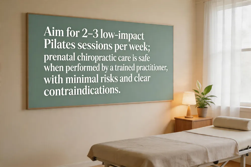 How often should you do Pilates while pregnant Aim for 2‑3 low‑impact Pilates sessions per week, with at least one rest day between workouts. Keep intensity low‑to‑moderate, allowing conversation without breathlessness. Modify each trimester: avoid supine, deep abdominal, and prone positions after 12 weeks; use side‑lying, seated, or prop‑assisted variations. Stop if pain, dizziness, or excessive fatigue occur, and always consult your chiropractor or a qualified prenatal instructor before starting or adjusting your routine.