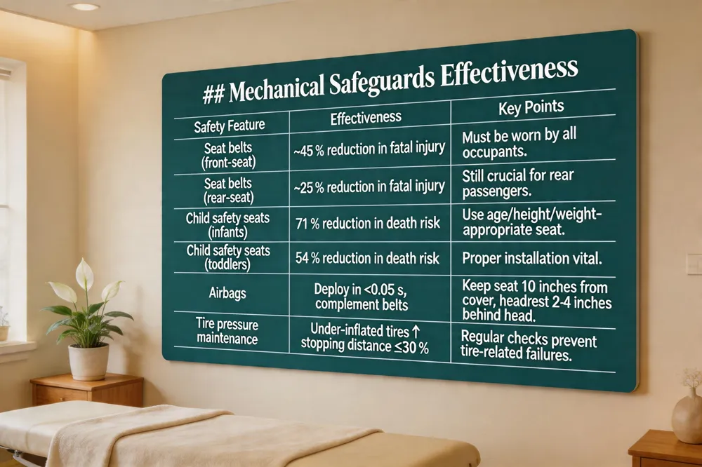 | Child safety seats (infants) | 71 % reduction in death risk | Use age/height/weight‑appropriate seat. |