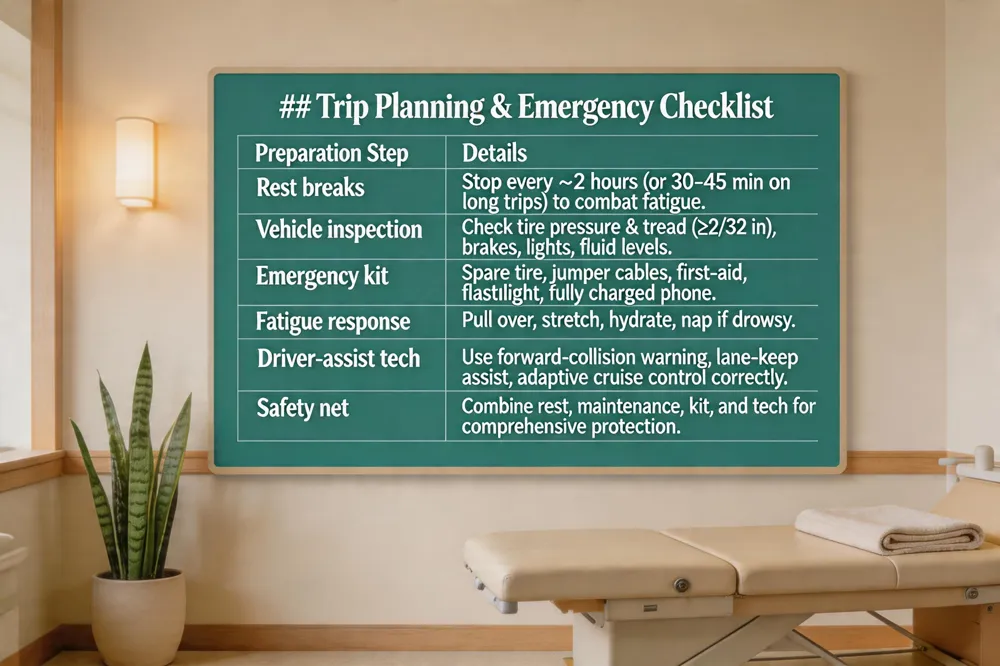 Regular rest breaks—about every two hours or every 30‑45 minutes on longer trips help combat driver fatigue, a factor linked to roughly 100,000 U.S. crashes each year. If you feel drowsy, pull over safely, stretch, and hydrate; a short nap can restore alertness and reduce the crash risk associated with impaired reaction time. Before you hit the road, conduct a thorough vehicle inspection: check tire pressure and tread depth (minimum 2/32 inch), confirm brake and light function, and verify fluid levels. A well‑stocked emergency kit—including a spare tire, jumper cables, first‑aid supplies, a flashlight, and a fully charged phone—can turn a minor breakdown into a controlled situation and prevent secondary accidents. Modern driver‑assistance technologies such as forward‑collision warning, lane‑keep assist, and adaptive cruise control further lower rear‑end crash rates by up to 50% when drivers understand and correctly use them. Combining disciplined rest, vehicle maintenance, emergency readiness, and smart use of assistance systems creates a comprehensive safety net for any road‑trip adventure.