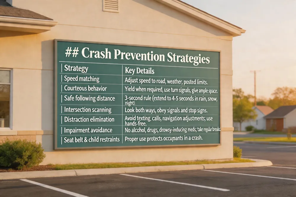 Drivers can cut their crash risk by matching speed to road and weather conditions and always obeying posted limits. Courteous behavior—yielding when required, using turn signals, and giving other motorists ample space—creates a predictable traffic flow. Maintaining a safe following distance (the three‑second rule, extended to four or five seconds in rain, snow, or night) gives enough time to react to sudden stops and helps prevent rear‑end and side‑impact collisions. Before entering an intersection, drivers should scan both directions and obey traffic signals and stop signs. Distractions such as texting, phone calls, or adjusting navigation should be eliminated; hands‑free devices are a safer alternative. Never drive under the influence of alcohol, drugs, or medication that causes drowsiness, and take regular breaks on long trips to avoid fatigue. Finally, seat belts and properly installed child restraints protect occupants in the event of a crash.