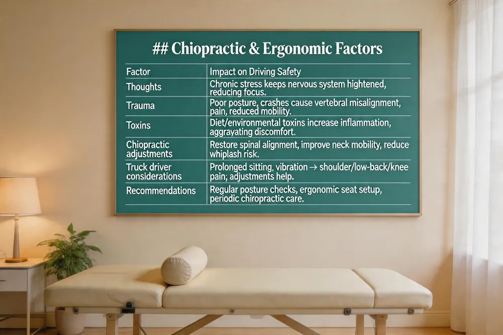 Special considerations for truck drivers include prolonged sitting, vibration, and limited stretch breaks. Chiropractic care can alleviate shoulder, low‑back, and knee discomfort without medication, allowing drivers to stay alert and perform their duties safely.