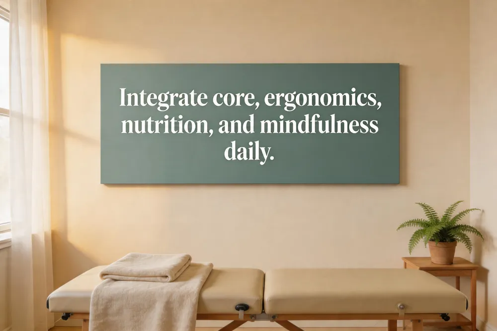 Integrating core‑strengthening moves such as planks, bridges, and bird‑dog into a 15‑minute routine, combined with ergonomic habits—adjustable chair lumbar support, monitor at eye level, and micro‑breaks every 30‑60 minutes—creates a neutral spine throughout the day.