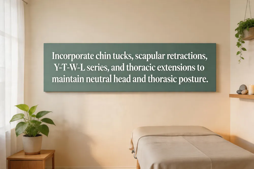 Cervical spinal alignment exercises focus on gentle movements that promote a neutral head posture and relieve tension. Chin tucks, side‑to‑side neck stretches, scapular retractions, and shoulder rolls can be performed seated or standing, while “walking tall” with ears over shoulders maintains alignment throughout the day. Supine neutral head positioning—lying on a thin pillow or no pillow—reinforces the same posture in a low‑impact way; hold stretches for 15–30 seconds and chin‑tuck positions for a few seconds, stopping if pain radiates beyond the neck. Upper‑back strengthening exercises, as outlined in the AAOS PDF, include scapular squeezes, wall slides, and the Y‑T‑W‑L series targeting rhomboids and trapezius, combined with thoracic extension, side‑stretch drills, and banded rows (3 sets of 10‑15 reps). Core stability muscles form a supportive “cage” around the spine: deep stabilizers such as the transverse abdominis and multifidus, complemented by internal/external obliques, rectus abdominis, pelvic floor, erector spinae, and diaphragm, together provide a rigid yet flexible core that protects spinal alignment during everyday movement.