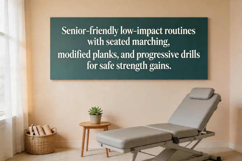 Senior‑friendly movements focus on low‑impact, equipment‑free exercises that protect the spine while building strength. Begin with seated marching or a dead‑bug (or seated dead‑bug), then progress to gentle bridges (lying on the back, knees bent, lift hips a few inches) and standing hip extensions. Low‑impact strengthening includes modified planks on the knees or forearms, Bird‑dog extensions performed slowly, and side‑leg lifts that engage the glutes and core without excessive loading. For beginners, a starter routine of seated marching, wall push‑ups, basic hip bridges, and knee‑plank holds (30‑45 seconds) performed 2‑3 times per week teaches proper alignment and diaphragmatic breathing. Core stability training for patients starts with deep‑breathing and abdominal bracing, moves to supine leg marching and dead‑bug drills, then adds prone Bird‑dog and bridging variations, advancing to dynamic moves such as weighted planks or Pallof press only when pain‑free technique is maintained. Progression guidelines recommend 8‑12 repetitions or 20‑30 second holds, 2‑3 sessions weekly, with gradual increases in range, duration, and resistance while monitoring for discomfort.