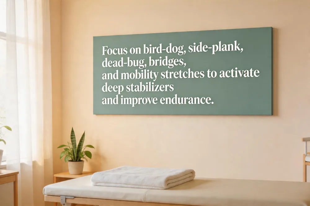 Core strengthening exercises for lower back pain physical therapy – Supine pelvic tilts, side‑lying clamshells, modified side‑planks, dead‑bugs, forearm planks and Pallof presses are therapist‑approved. Begin with 5‑10 reps or 20‑30‑second holds, increase to 2‑3 sets, and practice twice daily with controlled breathing to enhance deep trunk activation and reduce pain.
