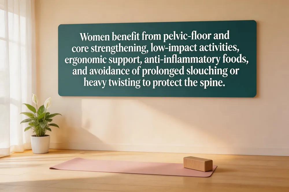 Women can reduce back pain by strengthening the core and pelvic floor, practicing low‑impact activities (walking, swimming) and daily stretches such as knee‑to‑chest, cat stretch, and bridge, and maintaining ergonomic posture with supportive footwear. For female lower‑back pain, gentle spinal mobilizations and ergonomic adjustments combined with targeted core and pelvic‑floor exercises, heat or low‑dose NSAIDs, and active low‑impact movement provide relief and prevent flare‑ups. Home remedies include 48 hours of ice followed by gentle heat, supportive sleeping positions, hydration, daily low‑impact stretches, and anti‑inflammatory herbs like turmeric or ginger. To protect Degenerative disc disease, avoid prolonged slouched sitting, heavy lifting with a rounded back, high‑impact sports, smoking, and repetitive twisting or bending. Degenerative disc disease does not shorten lifespan; with proper conservative management—including chiropractic care, exercise, and lifestyle changes—individuals can expect normal life expectancy and improved quality of life.