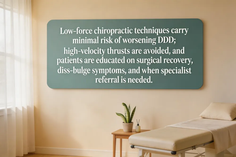 When evidence‑based, low‑force techniques are used and imaging confirms stability, the risk of worsening DDD is low. Aggressive high‑velocity thrusts on compromised segments can increase inflammation, so gentle mobilizations and soft‑tissue work are preferred.
