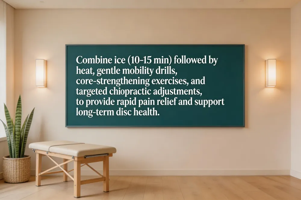 For instant back‑pain relief, apply a cold pack for 10‑15 minutes to reduce inflammation, then follow with a warm compress for another 10‑15 minutes to loosen tight muscles. Gentle movement—such as a slow cat‑cow stretch or a brief walk—helps restore blood flow and prevents stiffness. Good posture while sitting and a neutral sleeping surface further protect the spine. At home, start with ice (15‑20 minutes) then heat, and perform easy mobility drills like knee‑to‑chest, rotational stretches, and pelvic tilts, repeating 2‑3 times. Keep moving with short walks and stay hydrated. For severe pain, continue ice for the first 48 hours, add gentle stretches, low‑impact aerobic activity, and core‑strengthening moves (bridges, bird‑dogs). A short series of chiropractic adjustments and soft‑tissue therapy can reduce spasm, improve alignment, and support long‑term recovery. Most patients do not experience lasting worsening of sciatica after chiropractic; any temporary flare‑up is normal and resolves quickly. The best pain relief for degenerative disc disease combines targeted chiropractic adjustments, therapeutic exercise, NSAIDs or short‑term anti‑inflammatories, heat/ice, weight management, ergonomics, and lifestyle counseling. The optimal non‑surgical back‑pain treatment is a multimodal program: physical therapy, core‑strengthening home exercises, regular chiropractic care, stress‑reduction techniques, and, when needed, targeted injections or adjunct modalities like massage and acupuncture.