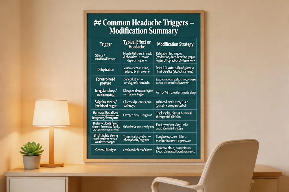 Understanding the most common headache triggers—stress, dehydration, irregular meals, poor sleep, caffeine swings, hormonal shifts, bright lights, strong odors, weather changes, alcohol, and posture—lets you take steps toward relief. Simple habits such as hydration, meals every 3‑4 hours, consistent 7‑9 hours of sleep, moderate caffeine, stress‑reduction practices (meditation, yoga, deep‑breathing), avoiding trigger foods, and maintaining ergonomic posture can lower attack frequency. Chiropractic care complements these measures by correcting spinal misalignments, easing neck‑muscle tension, improving blood flow, and restoring nervous‑system balance. Schedule an initial assessment, keep a headache diary, and work with a chiropractor to tailor a prevention plan that fits your lifestyle.