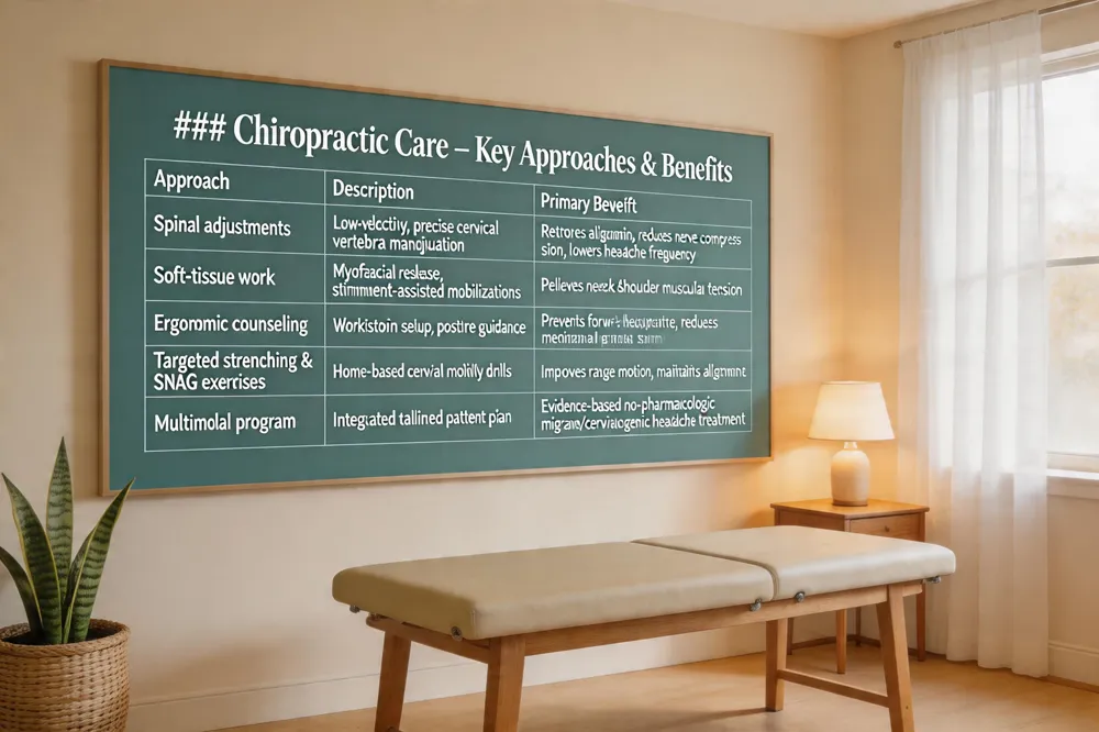 | Spinal adjustments | Low‑velocity, precise manipulation of cervical vertebrae | Restores alignment, reduces nerve compression, lowers headache frequency |