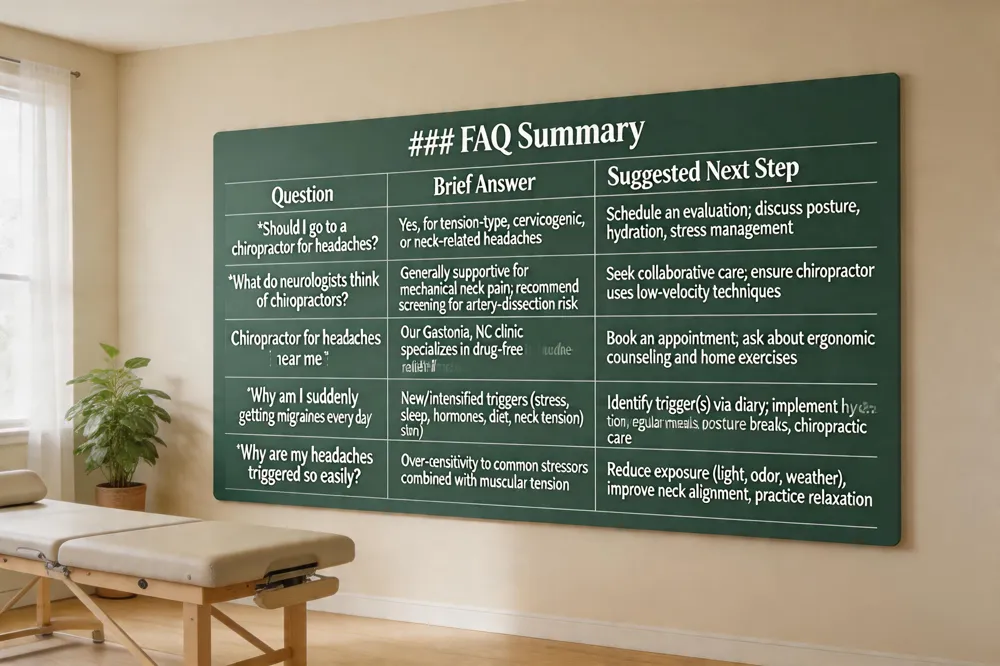 | Should I go to a chiropractor for headaches? | Yes, for tension‑type, cervicogenic, or neck‑related headaches | Schedule an evaluation; discuss posture, hydration, stress management |