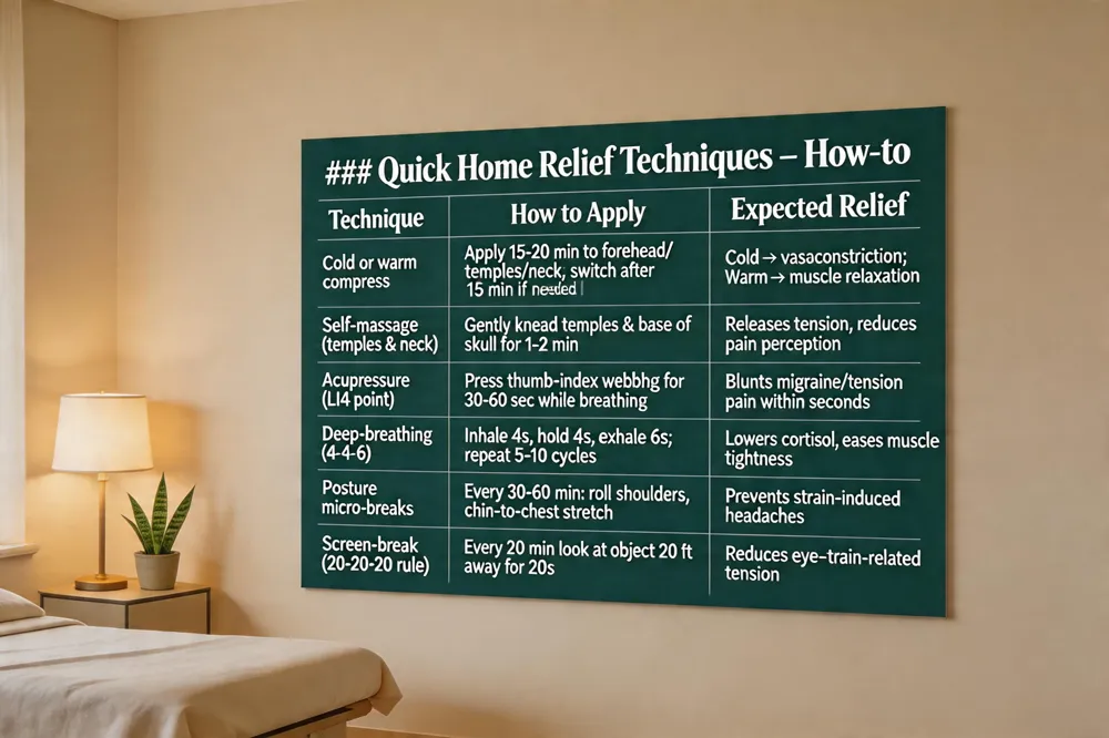 | Self‑massage (temples & neck) | Gently knead temples & base of skull for 1‑2 min | Releases tension, reduces pain perception |