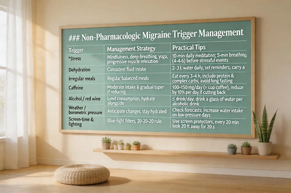 Weather and barometric‑pressure awareness: Rapid pressure drops or temperature swings can precipitate migraines—monitor forecasts and stay hydrated when weather changes are expected.