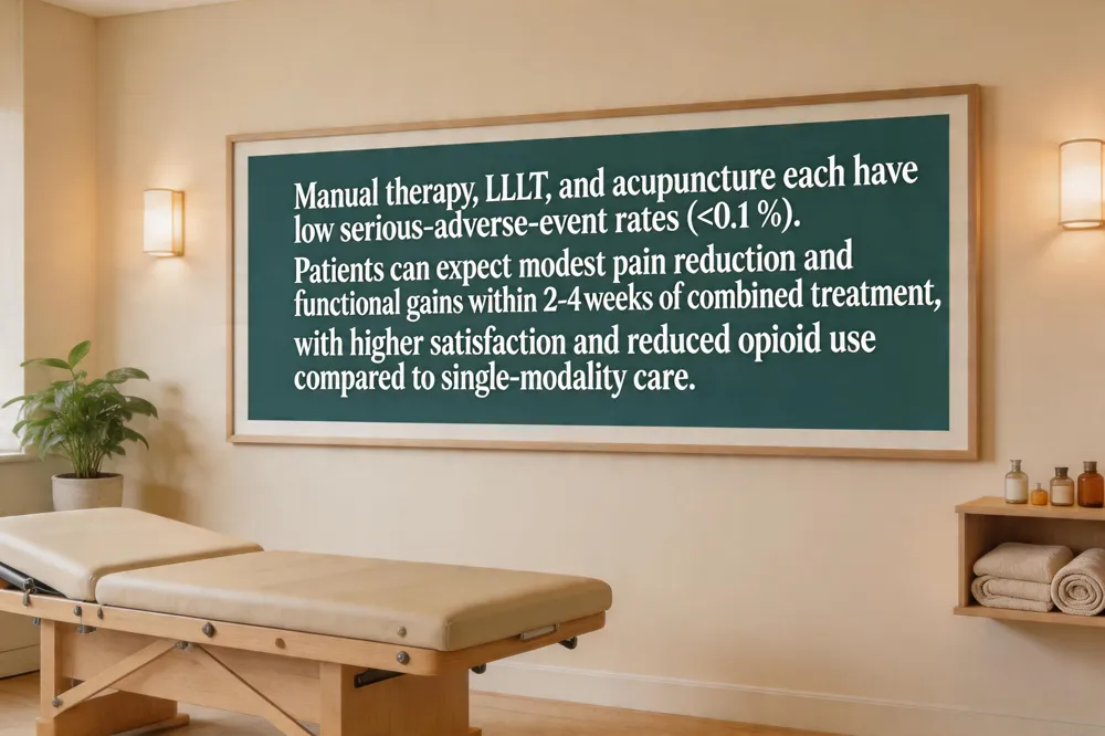 Patients can expect modest but clinically meaningful pain reduction and functional gains within 2–4 weeks of combined treatment, especially for low back, neck, and joint disorders. Multimodal care—manual therapy plus laser and acupuncture often yields faster symptom relief and higher satisfaction than any single modality alone. Improvements are typically measured by VAS, Oswestry Disability Index, or WOMAC scores, and many individuals report reduced reliance on opioid medications.