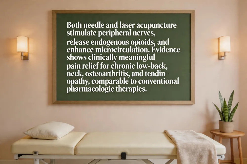 Evidence for chronic pain relief: Systematic reviews and randomized controlled trials repeatedly show that acupuncture—whether needle‑based or laser‑based—produces clinically meaningful reductions in chronic low‑back pain, neck pain, osteoarthritis, and tendinopathy. Meta‑analyses report effect sizes comparable to conventional pharmacologic therapies, and combined manual therapy with laser therapy or needle acupuncture yields greater pain relief and functional gains than any single modality alone.