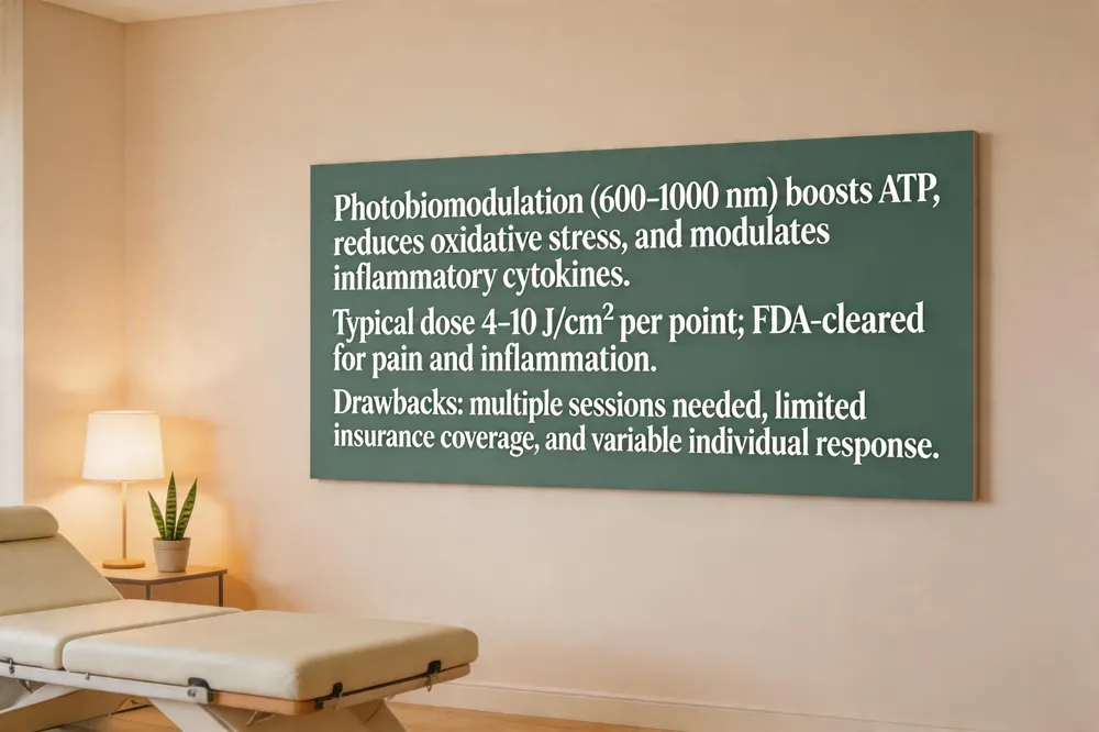 Photobiomodulation works by delivering red to near‑infrared light (600‑1000 nm) that is absorbed by mitochondrial chromophores, increasing ATP production, reducing oxidative stress, and modulating inflammatory mediators such as IL‑6 and TNF‑α. Typical therapeutic dosages range from 4‑10 J/cm² per point, with 808‑nm continuous and 905‑nm pulsed wavelengths (e.g., Mphi 75) providing anti‑inflammatory and analgesic effects. Low‑level lasers are FDA‑cleared for pain and inflammation, and serious adverse events are rare when applied by licensed clinicians; mild skin redness or a transient warm sensation may occur.