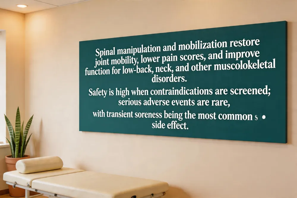 Spinal manipulation and mobilization are core manual‑therapy techniques used to restore joint mobility, reduce muscle tension, and diminish nociceptive input. Systematic reviews and randomized trials consistently show that these interventions lower pain scores and improve functional outcomes for low‑back, neck, and other musculoskeletal disorders (American College of Physicians, 2021; Miller et al., 2020). Safety is favorable when clinicians screen for contraindications; serious adverse events are rare, with transient soreness being the most common side effect.