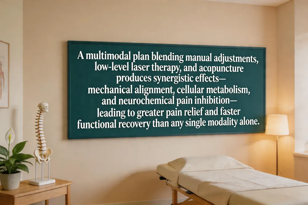 A multimodal, patient‑focused plan that blends manual therapy, low‑level laser therapy (LLLT), and acupuncture delivers synergistic pain relief. Manual adjustments restore biomechanical alignment, reducing nociceptive input; laser therapy activates cellular metabolism, increasing ATP production and microcirculation; acupuncture stimulates peripheral nerves, triggering endogenous opioids and neurotransmitter release. When combined, these mechanisms amplify each other, producing greater reductions in pain scores and faster functional recovery than any single modality alone, as documented in systematic reviews and meta‑analysis (American College of Physicians, 2021; Miller et al., 2020).