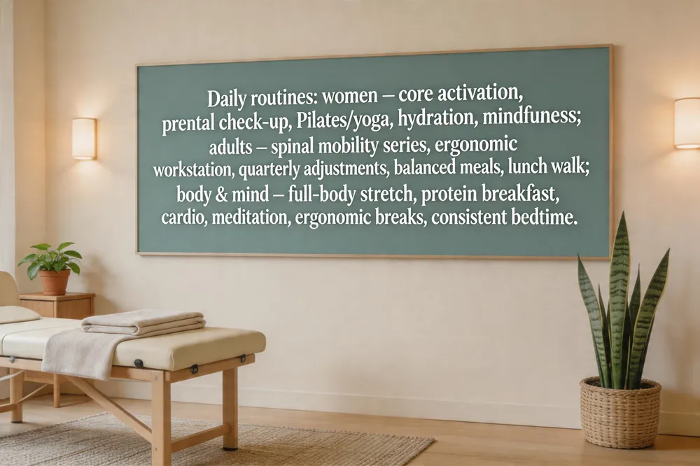 Daily routine for healthy body and mind Start with a full‑body stretch and, if needed, a brief chiropractic self‑adjustment or professional check‑up to promote proper spinal alignment. Follow with a protein‑rich breakfast—Greek yogurt with berries and nuts—and a 20‑minute walk or light cardio to increase circulation and clear the mind. Mid‑morning, pause for five minutes of mindfulness meditation to lower stress and improve focus. Throughout the workday, keep ergonomic posture, stay hydrated, and take short movement breaks every 60‑90 minutes. End the evening with light stretching, a wholesome dinner, and a consistent bedtime schedule to support restorative sleep and overall mental well‑being.