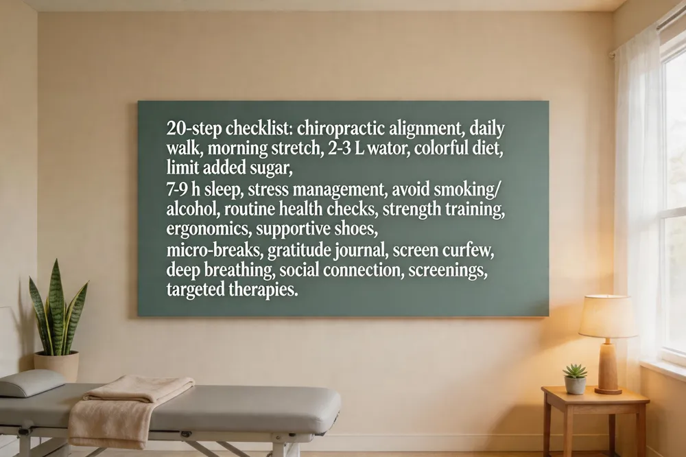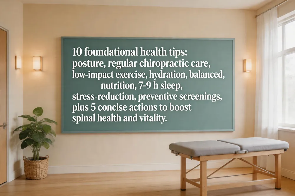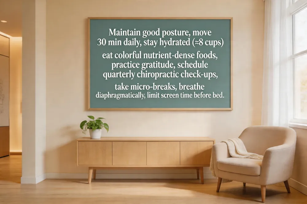 Simple health tips for everyday living Take micro‑breaks every 30‑60 minutes—stand, stretch, or walk a few steps—to improve circulation and reduce muscular fatigue. Hydrate consistently to support intervertebral disc nutrition. Fill your plate with antioxidants‑rich vegetables, fruits, and whole grains for fiber and micronutrients. Incorporate deep diaphragmatic breathing for a few minutes daily to lower stress hormones. Quarterly chiropractic assessments help keep the spine in optimal alignment and prevent chronic pain.