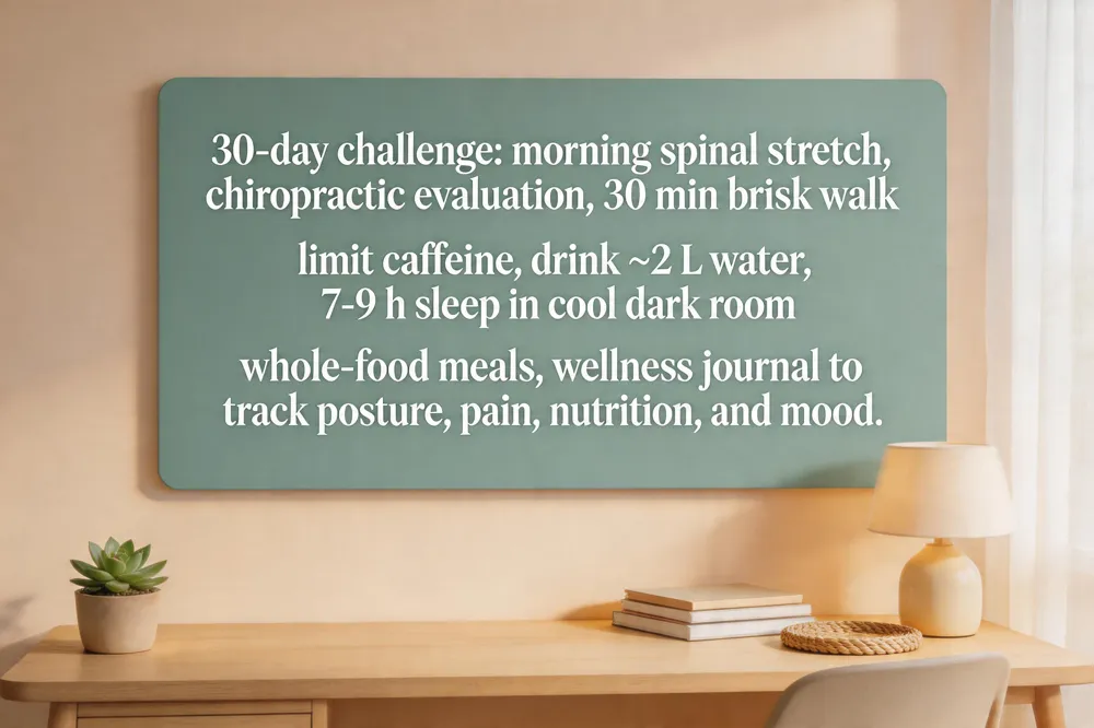 Begin each morning with a gentle five‑minute spinal stretch that mobilizes the back, awakens the nervous system, and improves circulation. By day 3‑5 schedule a comprehensive chiropractic evaluation; the practitioner can correct misalignments and give a personalized activity plan. Add at least 30 minutes of brisk walking or low‑impact cardio daily, and limit caffeine to a single cup. Drink eight glasses (≈2 L) of water to support disc hydration, detoxification, and joint health. Prioritize 7‑9 hours of quality sleep in a cool, dark room, and turn off screens at least one hour before bedtime. Fill your plate with whole foods rich in antioxidants, lean protein, and healthy fats to sustain energy and promote tissue repair. Keep a simple wellness journal to track posture, pain levels, nutrition, and mood, which helps maintain motivation throughout the challenge.