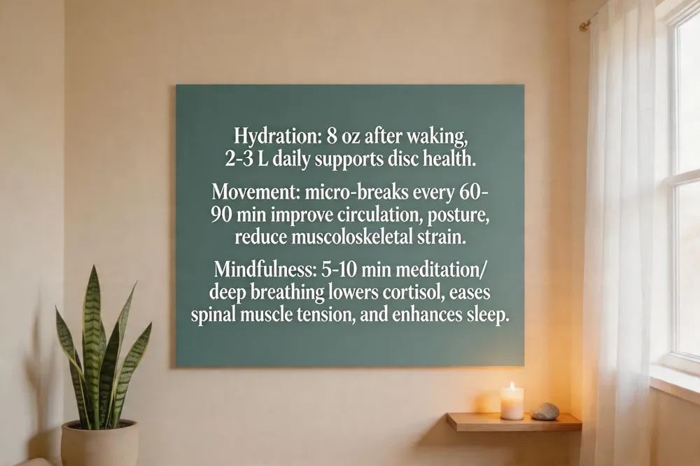 Mindfulness practices, including 5–10 minutes of daily meditation or deep‑breathing exercises lower cortisol levels and activate the parasympathetic nervous system. Reduced stress hormones translate into less muscle guarding around the spine, improved pain tolerance, and better sleep quality. When combined with proper hydration and frequent movement, mindfulness creates a synergistic effect that promotes spinal function, nervous‑system balance, and holistic well‑being.