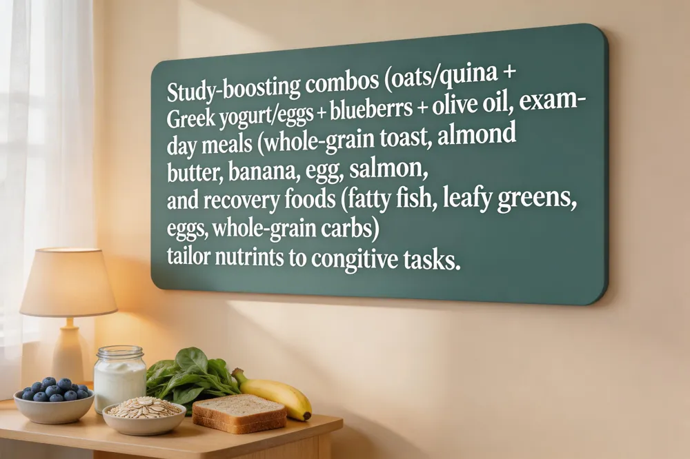 After mental strain or concussion, eat fatty fish (salmon, trout) for DHA, colorful berries and leafy greens for flavonoids, eggs or legumes for choline, olive oil and whole‑grain carbs for steady energy.