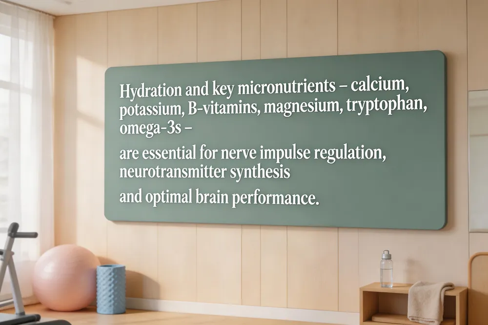 About 70 % of the brain is water, making it the most water‑rich organ in the body. This high water content maintains cell volume, supports electrical conductivity, and enables metabolic reactions; even mild dehydration can impair attention, mood, and memory. The nervous system depends on several key nutrients. Calcium and potassium regulate nerve impulses and are abundant in dairy, leafy greens, bananas and citrus fruits. B‑vitamins (B1, B2, B6, B12, folate) protect myelin and drive neurotransmitter synthesis, coming from whole grains, eggs, meat, seafood, and leafy vegetables. Magnesium from nuts and seeds stabilizes nerve membranes, while tryptophan in dark chocolate fuels serotonin production. Omega‑3 fatty acids from fatty fish or plant sources (walnuts, flaxseed) preserve neuronal membrane fluidity and reduce inflammation, together supporting optimal brain function.