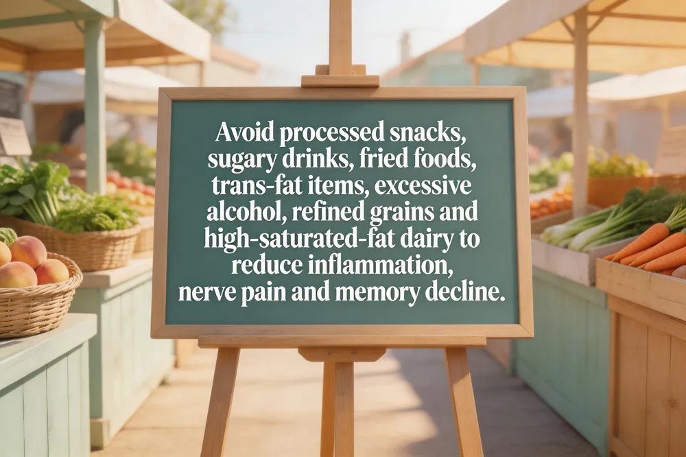 Food‑related inflammation is a major driver of nerve pain and memory loss. Highly processed snacks, sugary sodas, diet drinks, fried foods, and trans‑fat laden items raise blood‑sugar and oxidative stress, damaging nerves and impairing neurotransmitter balance. Excessive alcohol, refined carbs (white bread, rice) and high‑fat dairy also provoke inflammation and can aggravate neuropathy symptoms.