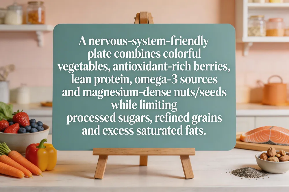 A nervous‑system‑supportive diet prioritises steady blood‑sugar, anti‑inflammatory foods and nutrients that nurture nerve health. Fill the plate with colorful vegetables, antioxidant‑rich berries, and leafy greens. Choose lean protein—fish, poultry, legumes—and omega‑3 sources such as salmon, walnuts, or flaxseed. Magnesium‑dense foods (nuts, seeds, dark greens) aid nerve conduction. Limit processed sugars, refined grains, excess saturated fats, and stay well‑hydrated. Combine protein, healthy fats and fiber at each meal to stabilise cortisol and keep the nervous system grounded.
