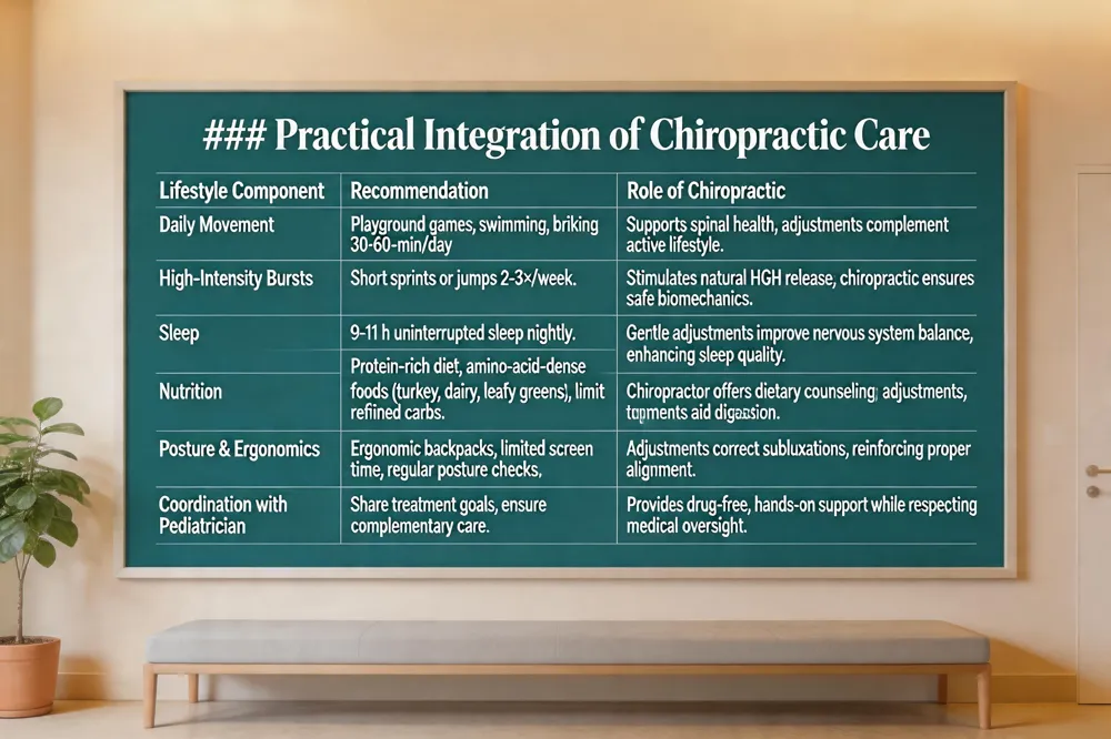 Gentle pediatric adjustments work best when paired with lifestyle habits that protect the spine and nervous system. Parents should encourage daily movement—playground games, swimming, or bike rides—and add short bursts of high‑intensity activity (sprints, jumps) a few times a week to boost circulation and naturally stimulate growth‑hormone release. Adequate sleep is critical; children need 9‑11 hours of uninterrupted rest, the period when the pituitary secretes the most HGH. A balanced diet rich in lean protein, healthy fats, fruits, vegetables, and amino‑acid‑dense foods (turkey, dairy, leafy greens) supports tissue repair and hormone production while keeping insulin low. Proper posture, ergonomic backpacks, and limited screen time reduce spinal strain. Finally, coordinate chiropractic care with the child’s pediatrician and any specialists, sharing treatment goals and ensuring complementary, evidence‑based management.