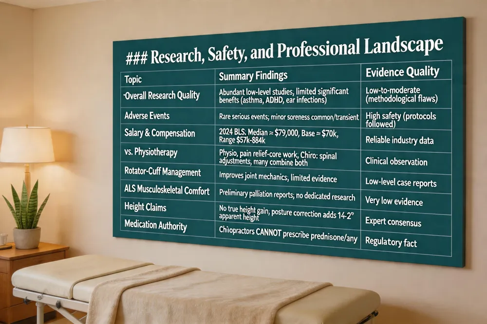 Current pediatric chiropractic research is abundant in quantity but thin in quality. Systematic reviews repeatedly note that most studies are low‑level, with limited or no statistically significant benefit for conditions such as asthma, colic, ADHD, or ear infections. Rare serious adverse events have been reported, while minor soreness is common and transient. Pediatric chiropractors typically earn a median annual wage of about $79,000 (2024 BLS), with average base pay around $70,000 and total compensation ranging $57,000‑$84,000; higher earnings occur in metropolitan areas or practices offering broader services. For sciatica, physiotherapy focuses on pain‑relief modalities and core‑strengthening exercises, whereas chiropractic emphasizes spinal adjustments that address nerve irritation; many clinicians combine both approaches for optimal outcomes. Rotator‑cuff injuries can be managed with chiropractic techniques that improve joint mechanics without surgery, though evidence is limited. Preliminary reports suggest chiropractic may palliate musculoskeletal discomfort in ALS, yet dedicated research is lacking. Chiropractic cannot increase actual height, but correcting postural subluxations can add ¼‑2 inches in apparent stature. Chiropractors are not authorized to prescribe prednisone or any medication; they provide drug‑free, hands‑on care and may refer patients to medical physicians when needed.