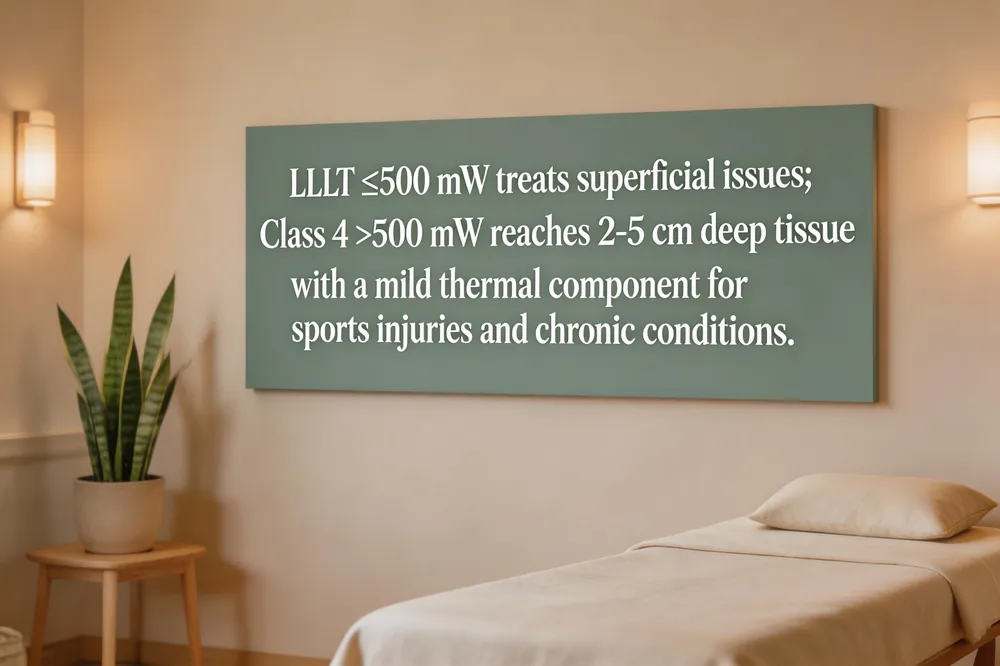 Class 4 laser therapy employs high‑powered devices (> 500 mW, often 1‑30 W) with wavelengths ranging from 600‑1100 nm that penetrate 2‑5 cm into muscle, tendon, ligament, and bone. The higher energy generates a mild warming sensation (thermal component) while still delivering photobiomodulation. It is used for deep‑tissue sports injuries, chronic tendonitis, arthritis, post‑operative rehabilitation, and nerve regeneration, with sessions lasting 5‑15 min.