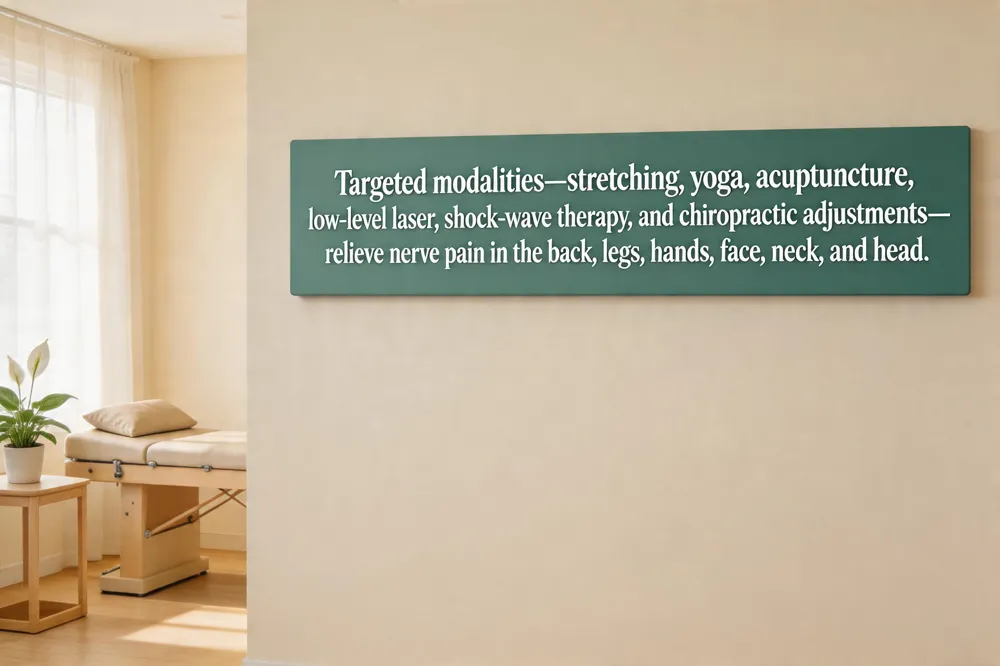 Back: Gentle stretching, yoga, alternating heat‑cold packs, and topical arnica reduce inflammation; acupuncture, cupping, and trigger‑point dry needling release tension; regular chiropractic adjustments and low‑level laser therapy realign the spine and relieve pressure on back nerves. Legs: Shock‑wave therapy boosts circulation; B‑vitamins (B12, B1, B6) and alpha‑lipoic acid supplements support nerve repair; chiropractic adjustments improve spinal alignment and blood flow; omega‑3‑rich diet and hydration aid overall leg nerve health. Hands: B‑vitamins and alpha‑lipoic acid nourish damaged nerves; cervical chiropractic adjustments lessen cervical compression; low‑level laser and gentle hand‑stretching enhance micro‑circulation; topical capsaicin may desensitize peripheral pain receptors. Face: Upper‑cervical chiropractic adjustments ease trigeminal pressure; acupuncture and jaw‑muscle physical therapy modulate pain; diluted peppermint or lavender essential oil provides soothing warmth; anti‑inflammatory herbs (turmeric, ginger) and B‑vitamins support nerve integrity. Neck: Neck stretches, chin tucks, and ergonomic posture reduce cervical nerve irritation; warm compresses with brief ice apply relax muscles; lavender, peppermint, or eucalyptus essential oils (diluted) improve local blood flow; turmeric and devil’s claw supplements diminish inflammation; regular chiropractic care maintains alignment. Head: Cervical adjustments improve brain blood flow; B‑vitamins (B12, B6, B1) and alpha‑lipoic acid protect nerves; Shock‑wave therapy stimulates scalp circulation; anti‑inflammatory foods (leafy greens, omega‑3 fish, turmeric) reduce neural irritation.