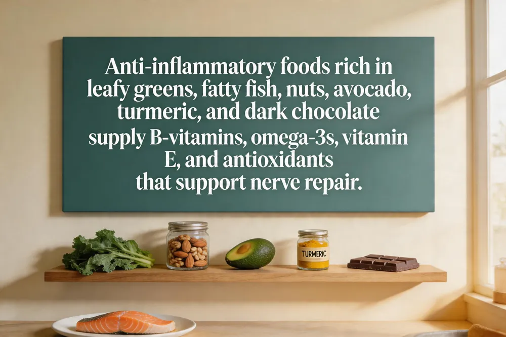 Nerve healing thrives on an anti‑inflammatory diet rich in leafy greens, fatty fish, nuts, seeds, avocado, turmeric and dark chocolate. These foods supply B‑vitamins, omega‑3s, vitamin E, potassium and powerful antioxidants that protect and rebuild nerve tissue.
