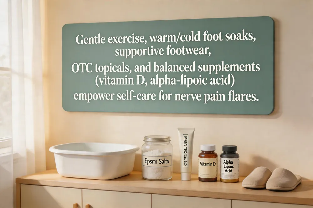 Managing nerve pain at home starts with gentle regular exercise—walking, low‑impact stretching, or guided physical‑therapy routines—to boost circulation and release endorphins. Warm compresses or foot baths with Epsom salts relax muscles, while cool packs dampen inflammation during flare‑ups. Over‑the‑counter topicals such as lidocaine, capsaicin, menthol gels, or essential‑oil blends provide localized relief. A balanced supplement plan—under professional guidance—may include vitamin D, alpha‑lipoic acid, or acetyl‑L‑carnitine to support nerve health.