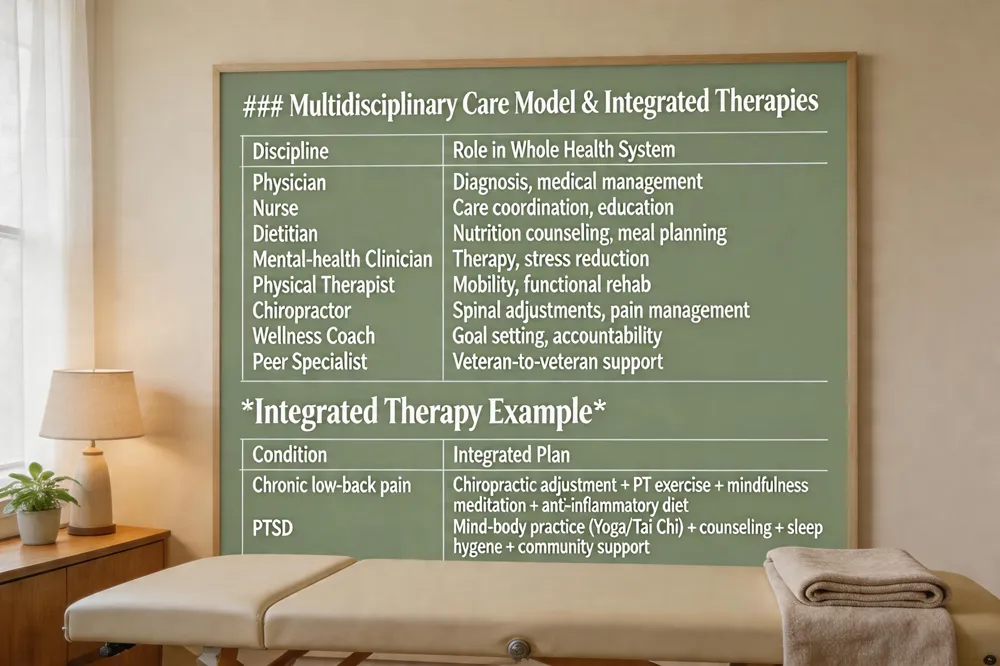 Multidisciplinary care models: At VA facilities and partner organizations, physicians, nurses, dietitians, mental‑health clinicians, physical therapists, and chiropractors work together in shared clinics or virtual teams. This collaboration enables seamless referrals, coordinated goal setting, and unified documentation, reducing duplication and ensuring that each veteran’s needs are met holistically.