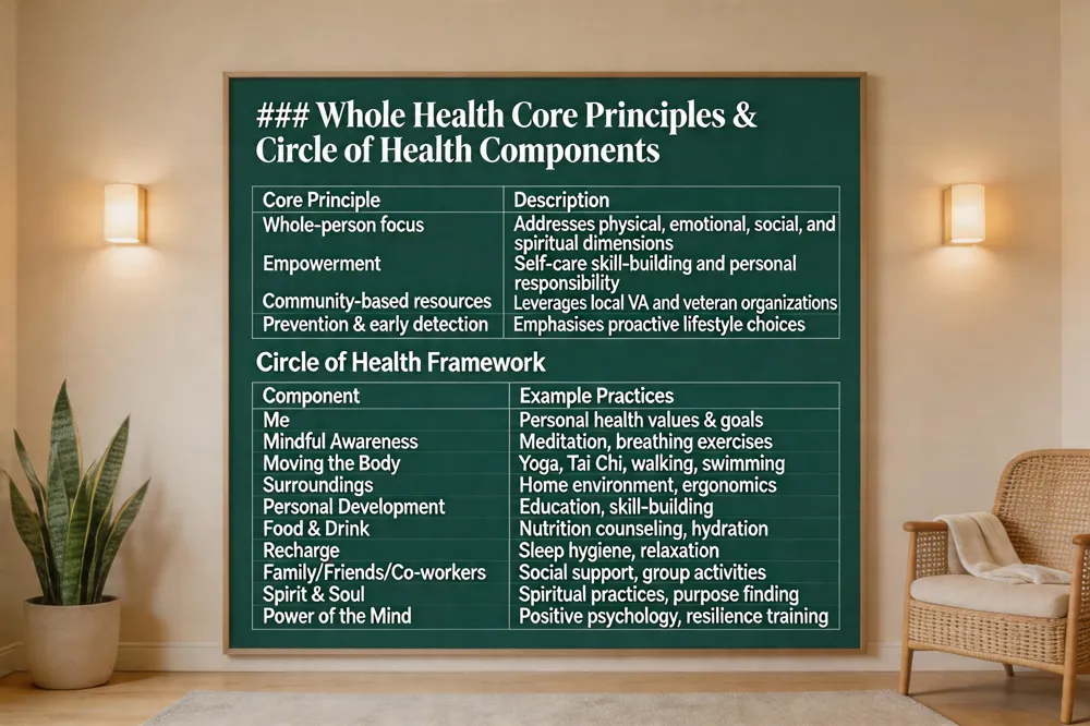 Whole Health is an integrative, patient‑centered philosophy that treats health as a dynamic resource for living well. It goes beyond treating disease by addressing physical, emotional, social, and spiritual dimensions, and by tackling behavioral, environmental, and social drivers such as nutrition, movement, relationships, and stress management. The VA’s Whole Health approach uses the Circle of Health framework—Me, Mindful Awareness, Moving the Body, Surroundings, Personal Development, Food & Drink, Recharge, Family/Friends/Co‑workers, Spirit & Soul, and Power of the Mind—to create personalized plans that blend conventional care with complementary services like chiropractic adjustments, yoga, Tai Chi, nutrition counseling, and mental‑health support. Core principles include: 1) a focus on the whole person rather than isolated symptoms, 2) empowerment through self‑care and skill‑building, 3) community‑based resources, and 4) prevention and early detection. Unlike disease‑focused care, which centers on diagnosing and treating specific illnesses, Whole Health emphasizes proactive lifestyle choices, interdisciplinary collaboration, and the therapeutic relationship to improve overall vitality and quality of life. This holistic blueprint enables veterans to achieve lasting well‑being by integrating evidence‑based medical treatment with mind‑body practices, nutrition, sleep hygiene, and social connection.