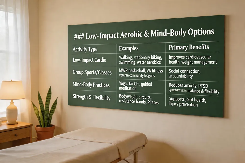 | Group Sports/Classes | MWR basketball, VA fitness classes, veteran community leagues | Social connection, accountability |